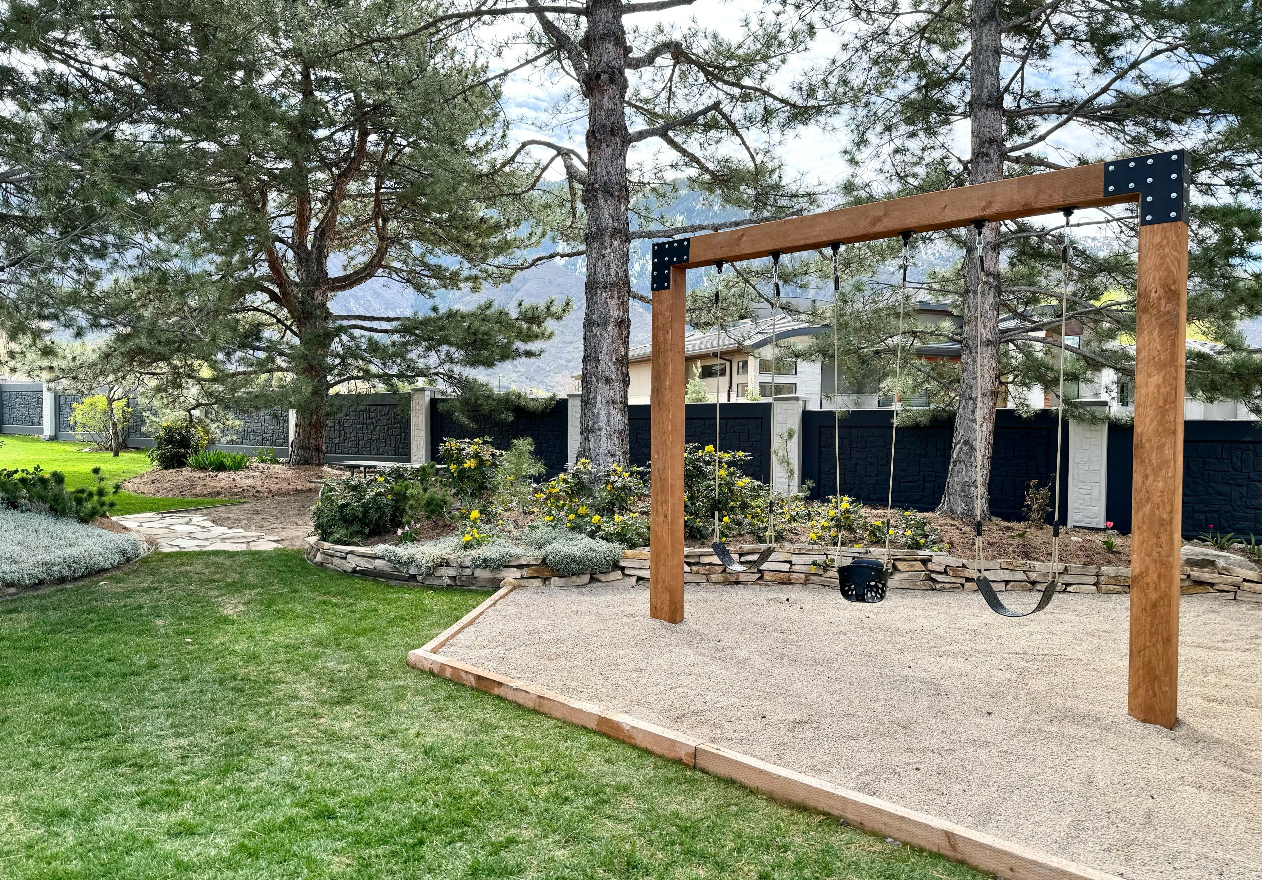 Designed to elevate your outdoor space with its sleek and modern aesthetic, this swing set is crafted with 8-in. x 8-in. in Douglas Fir #1 FOHC (Free of Heart Center) wood, ensuring durability and longevity. The high-quality 12-gauge galvanized steel brackets further increase the sturdiness, promising years of enjoyment for you and your loved ones.
